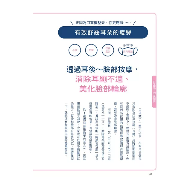 這幾天我閱讀了這本《口罩底下的美顏術》書裡用插圖和三位日本專家(造型師、臉部肌肉專家、美肌達人)提供許多讓載口罩成為變美、舒適防疫的妙招。