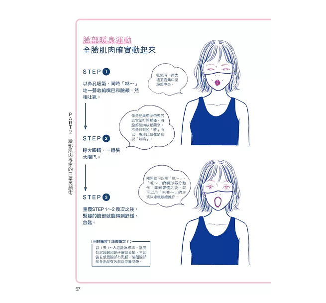 在這個章節裡,照著插圖和文字說明一起動一動身體和臉部,反正在口罩底下擠眉弄眼還不至於明顯到引人側目。