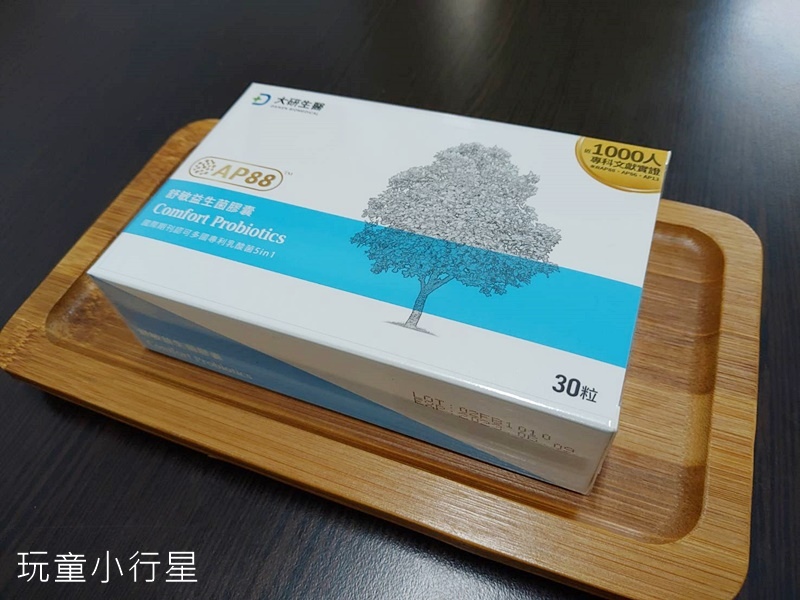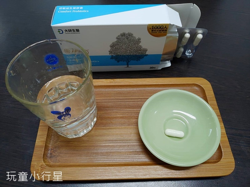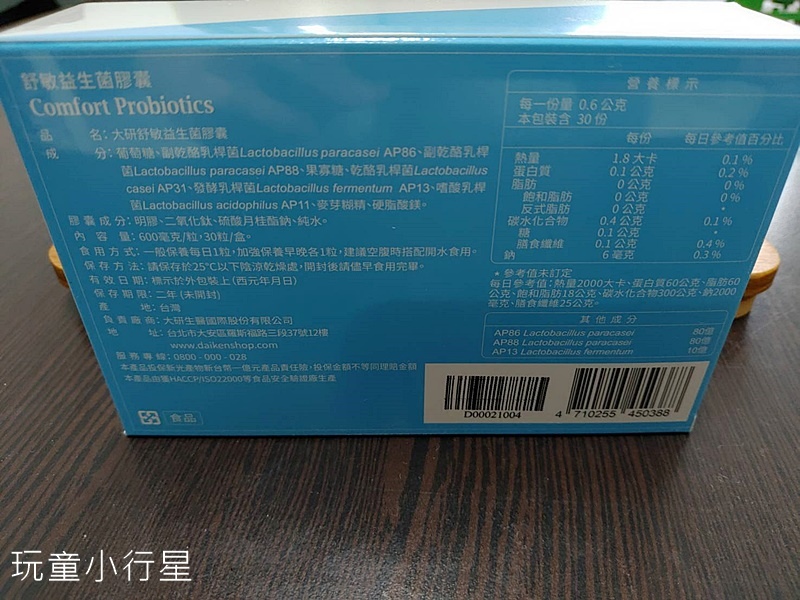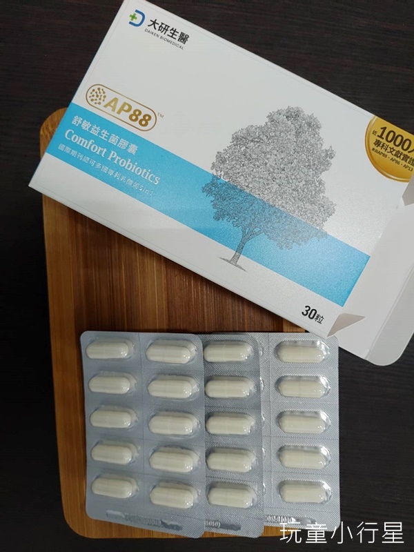 大研生醫舒敏益生菌,一盒有30顆膠囊。可以一天吃一顆,也可以早晚各一粒增強保養。