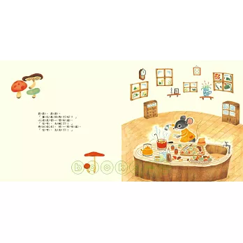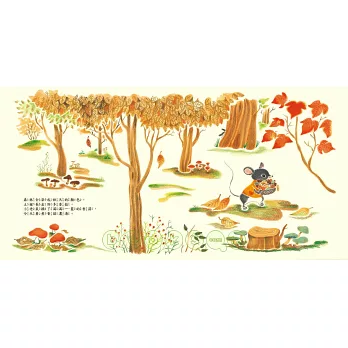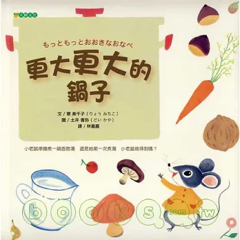 秋天是豐收的季節,小老鼠想在這微涼的天氣煮一鍋湯,想吃的料越加越多,鍋子不夠大。去找小松鼠,松鼠分享了核桃和栗子,丟進去鍋子又不夠大啦!接著重複這樣子的情節,找了兔子、山羊、小熊。聰明的你一定發現了,故事裡的動物體型越來越大,使用的鍋具也是越來越大。最後大家一起吃,分享這鍋溫暖的湯。分享的快樂,不禁讓我想起了《石頭湯》這本書,美味的石頭湯打開人們的心房,展現分享。