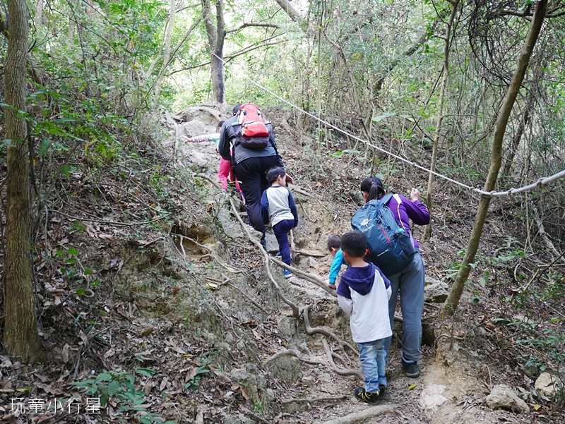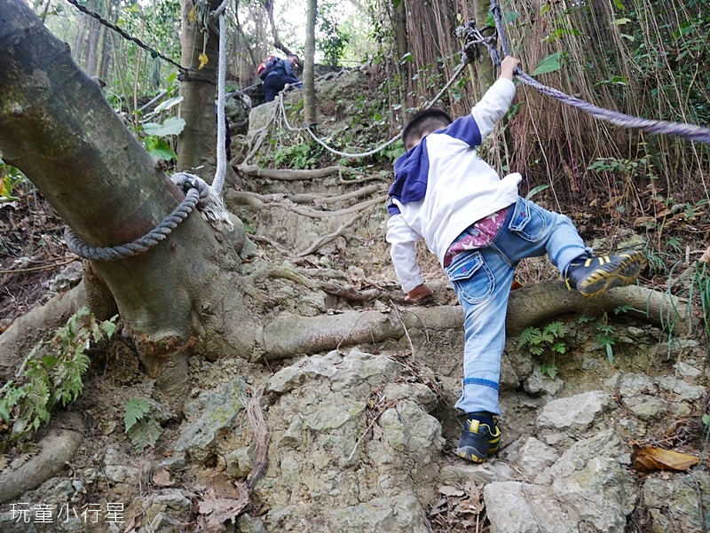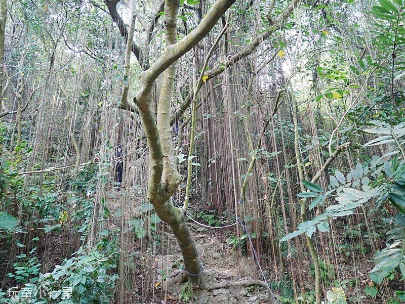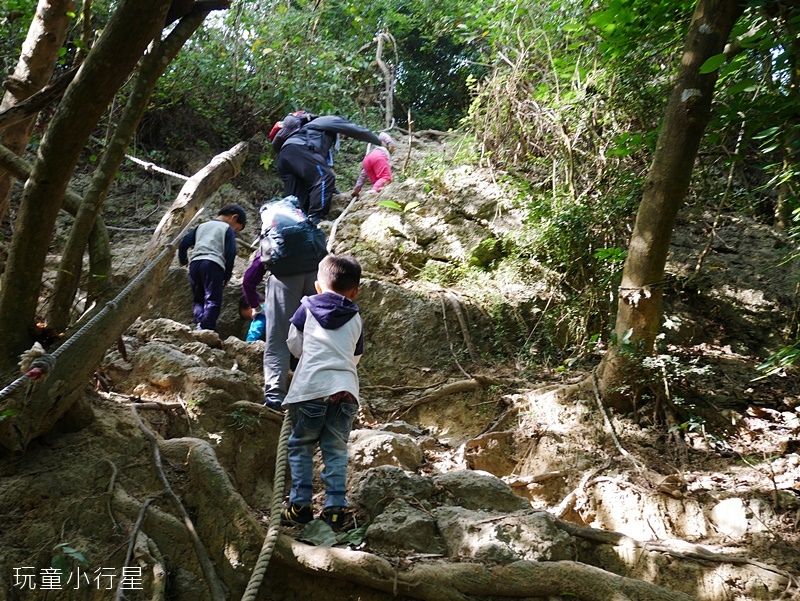 我們在前往盤榕的路上,看到側旁小徑有人拉繩爬上。正在猶豫要不要跟上,小朋友們很想挑戰,於是向其它山友詢問路線,得知此處上去右轉,再走一段拉繩路即可接到木棧階梯。