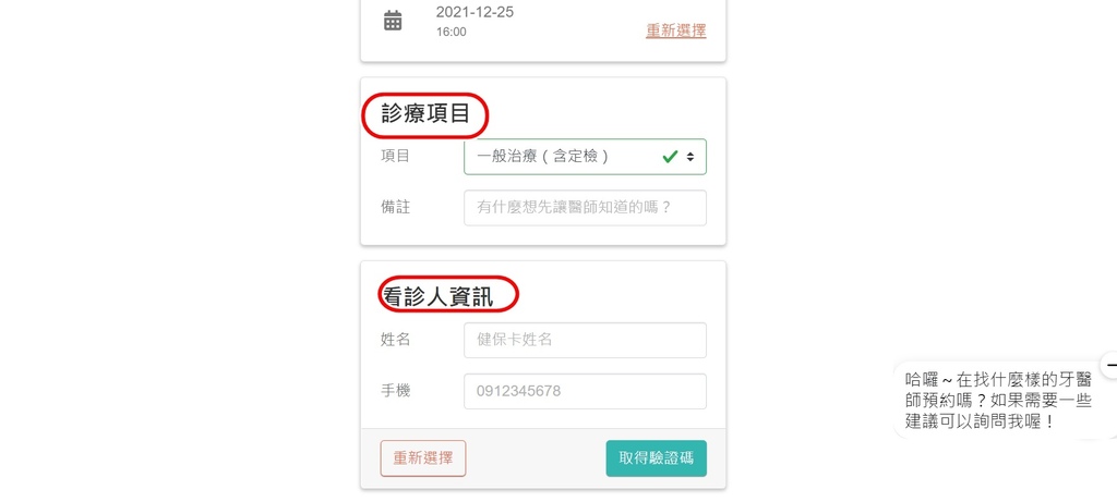 最後一個步驟確認診療項目,將自己方便看診的時間挑選好,輸入姓名手機,就會收到看診的提醒簡訊。