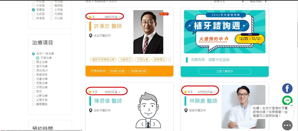 按下搜尋後即會出現所在地區的牙醫,接下來就可以依照自己要看診的項目,搭配醫師專業、使用者評論來判斷要選擇的醫師。