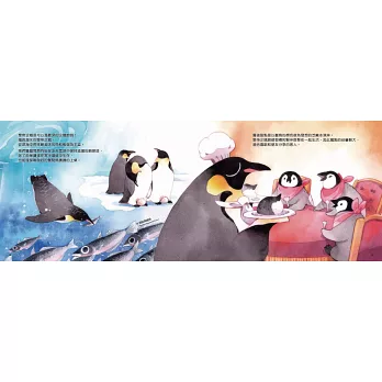 《企鵝餐廳》是本介紹企鵝品種、習性的繪本,作者飆飆先生以“美食“為主軸,將每個品種的企鵝的生活習性、成長環境融合在故事中。讓我們在閱讀故事時不知不覺的認識每種企鵝。