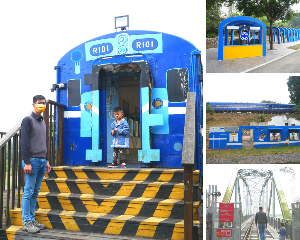 鐵橋另一側放置了一列藍皮車廂,兒子沒有搭過藍皮列車,好奇的往內探訪。