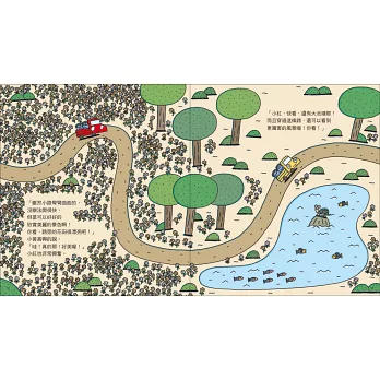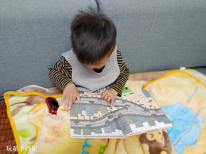繪本裡有車有道路,一邊閱讀一邊拿著小車駕駛是他與書互動的樂趣。