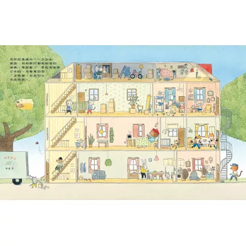 其中《老鼠郵差來了》、《老鼠郵差去度假》、《老鼠郵差去哪裡?》、《來我家到你家》,這4本裡可以看到建築物以剖面圖的方式呈現,畫面中蘊涵許多細節,有時我們還待前後翻閱參照才能發現哪裡不一樣呢!