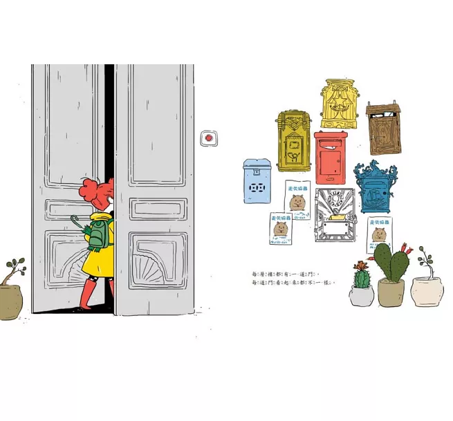 《神祕的鄰居》裡的小女生在她回到頂樓的家前,每經過一戶就會跟讀者介紹鄰居,隔頁呈現鄰局家中場景,頗有一探密境意味。