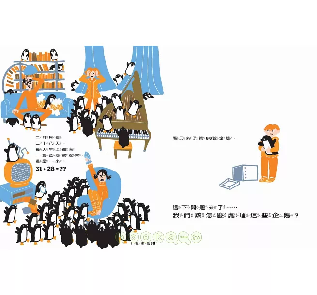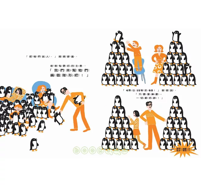 一翻開這個故事,內容實在太有趣了!成群的企鵝,讓我們都快要跟書中的一家人一般快得了企鵝恐懼症了。