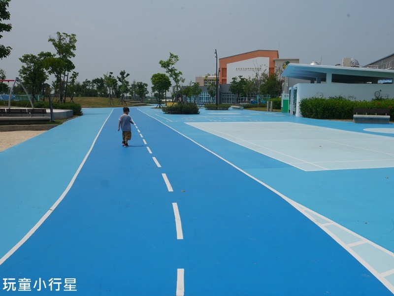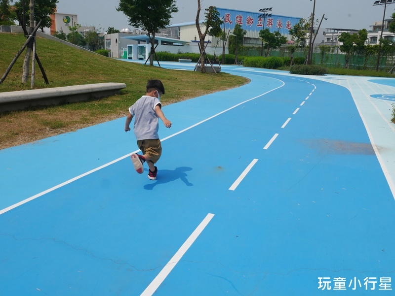 看到這美麗的藍色跑道,兒子忍不住跑了起來。