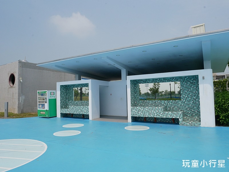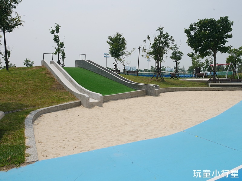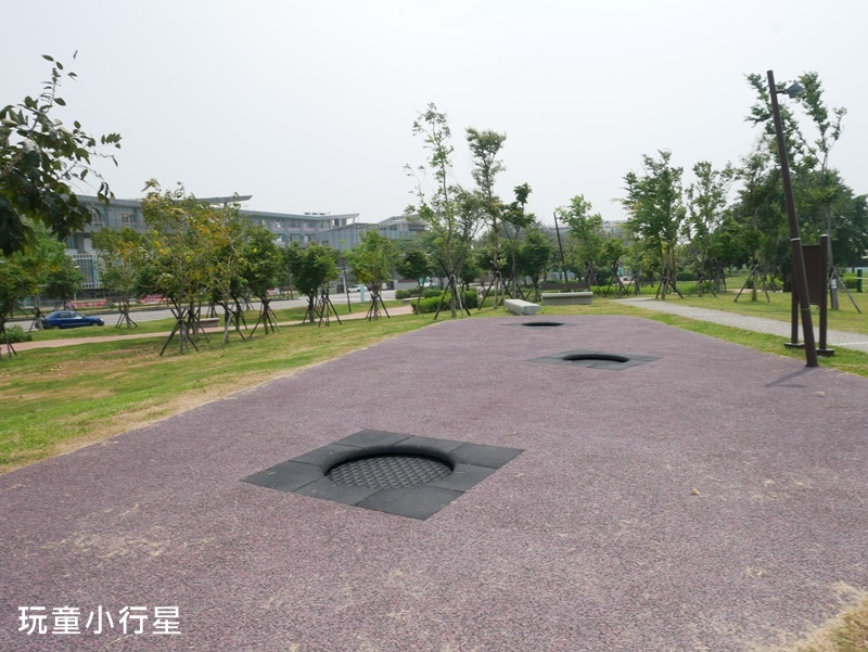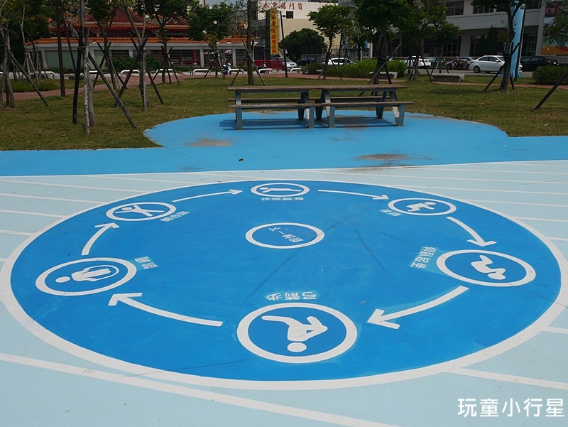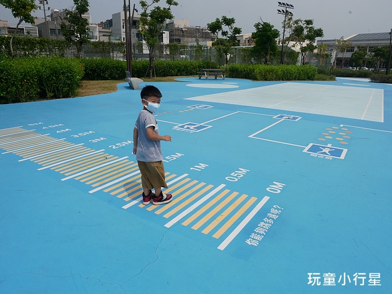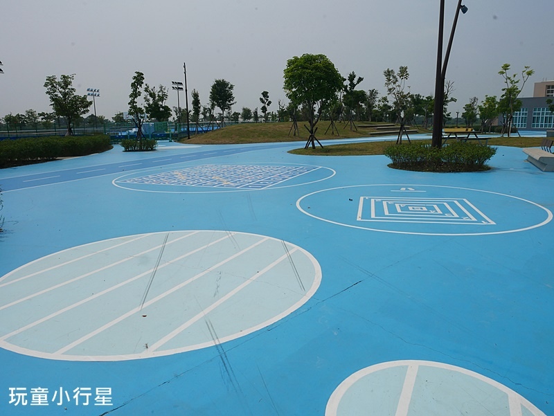 去年整健完後,公園內大量舖設藍色地面,地面上還繪製了跳遠、格子、球場框線…