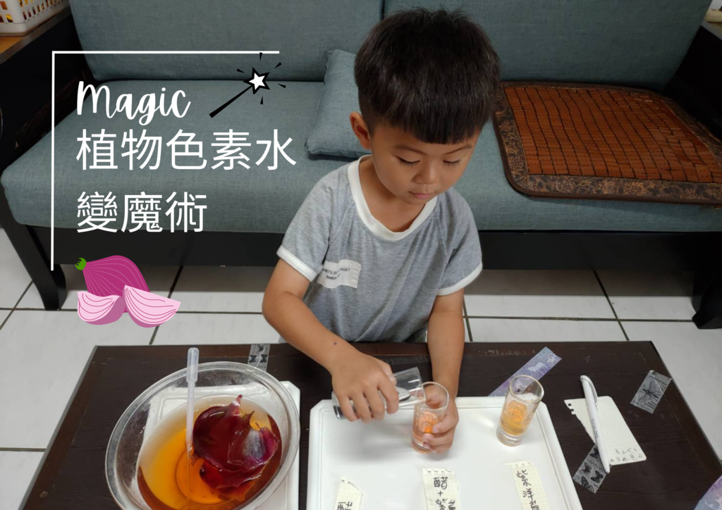 這個運用蔬果類型的植物本身的色素水來進行變色實驗,我們是在共讀巧連智《超級小學生》裡所看到的一則實驗。
