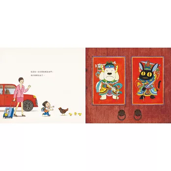 接著再翻下一頁,《魔法阿媽:豆豆的夏天》有一頁上畫著門神,以阿嬤家的狗、貓為門神主角,看起來神氣威武中帶著萌樣。
