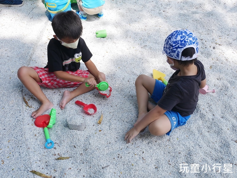 角落有一個小型沙坑,非可塑型的沙子,是白色的小石頭。