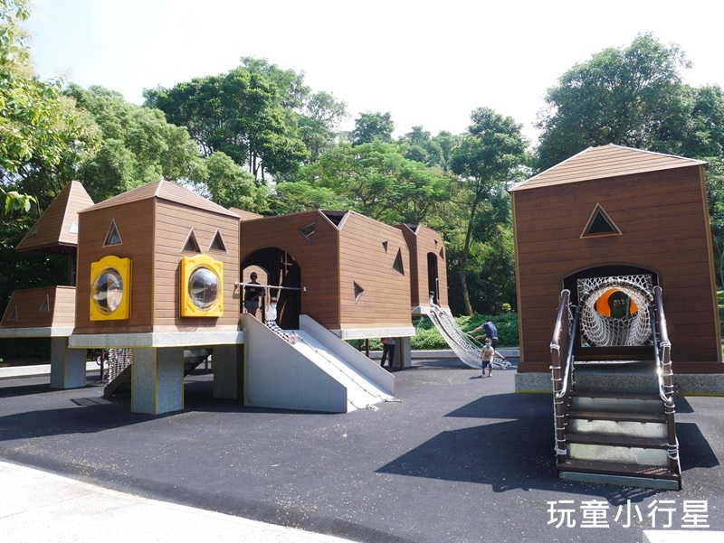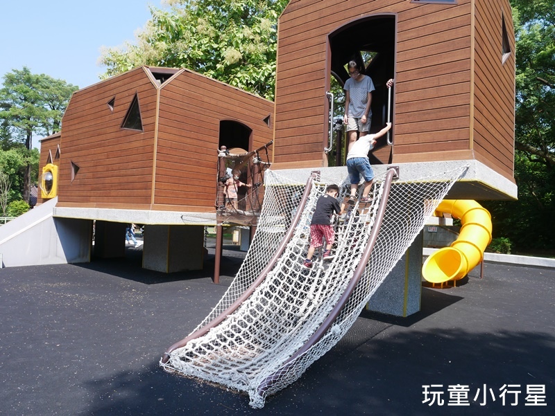 樹屋遊戲區結合攀爬、滑溜、平衡、探險樂趣。