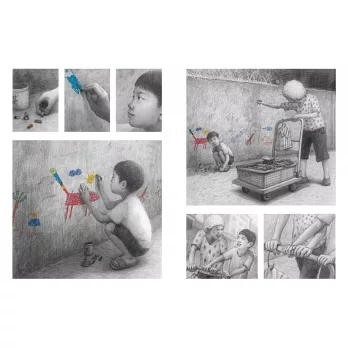 《我的粉蠟筆》是一本沒有無字的繪本,細膩的鉛筆筆觸,刻劃出動人真摯的角色情感。
