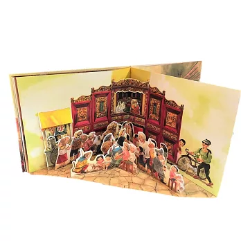 書本內有立體頁面,可以看到布袋戲在廟埕演出時,鄉民們捧場的畫面。