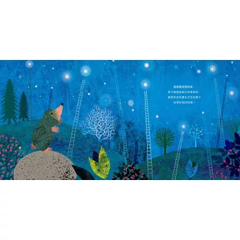我好喜歡故事裡的圖畫,動物們在黑夜中欣賞熠熠生輝的夜空。