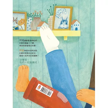 《阿福與阿金》是兩個個性和習慣截然不同的朋友。 阿福與阿金這兩隻貓的插圖分別以不同頁面呈現彼此的不同。 我很喜歡故事中描述《阿福與阿金》跳舞的模樣,即使兩人喜歡的跳舞方式不一樣,他們仍願意一起去嘗試可以共同跳的舞。 《阿福與阿金》嘗試了踢踏舞、騷莎舞、霹靂舞、肚皮舞、芭蕾舞… 我和兒子邊看邊認識了這些舞蹈呈現的跳法,畢竟我們倆個對舞蹈一竅不通。 最後…能夠陪伴彼此才是最重要的。