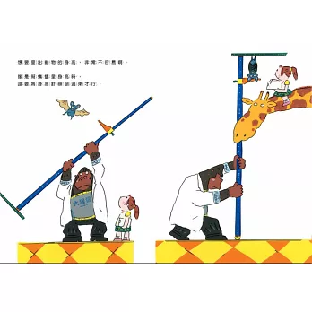 我們可以一起想一想,如果你要準備工具幫大型動物,例如長頸鹿、大象量身高和體重,要準備什麼樣的工具?要怎麼帶領他們站上測量工具呢?