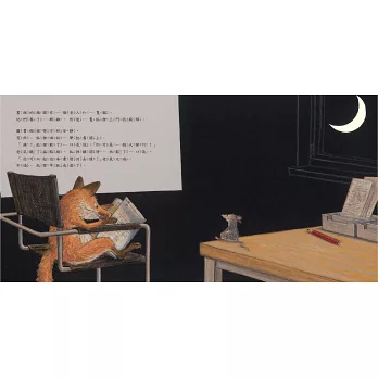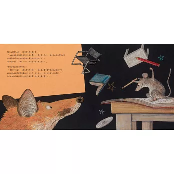 老鼠介紹圖書館的功能,狐狸被圖書館吸引,完全忘了要吃老鼠這件事。