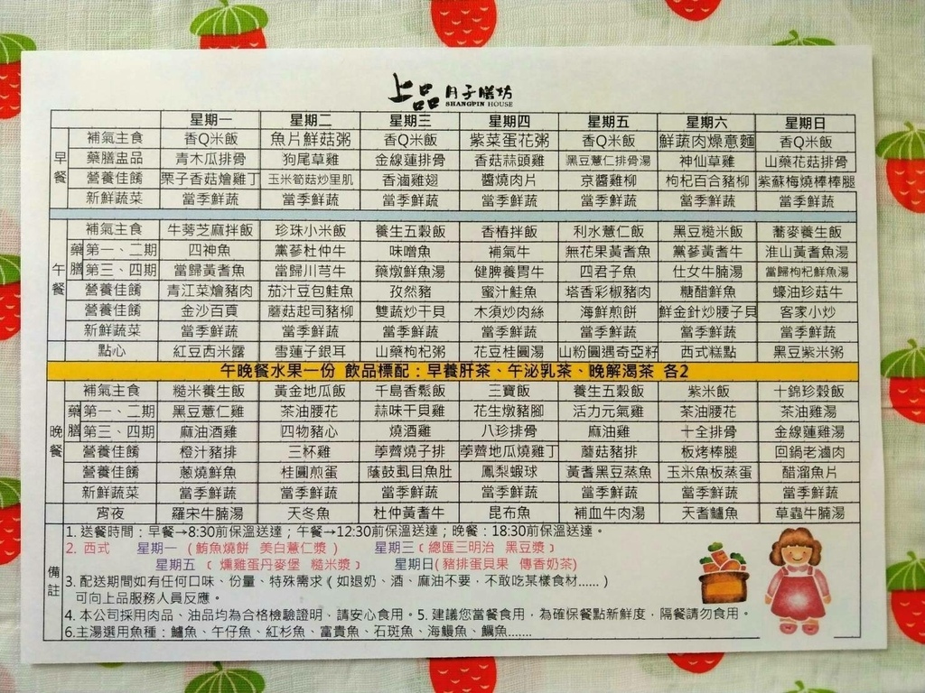 ▲不用預定、預付,產後供餐提前一餐或一天告知。