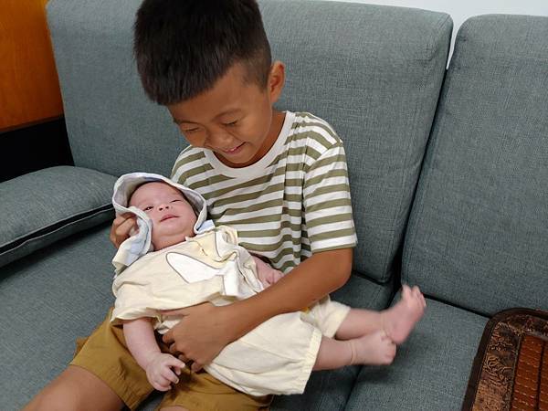 接著你就會看到我像抱嬰兒那般直立的抱著大寶,小學二年級身材尺寸要我站著直直抱著他當然很吃力,所以我通常是坐著抱大寶。