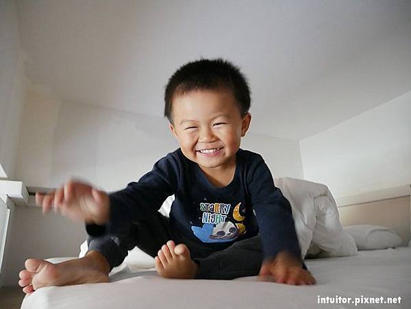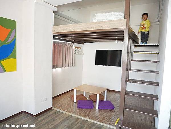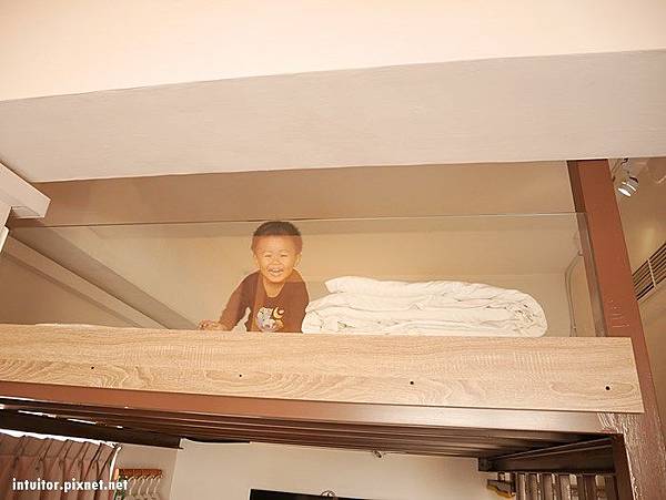 沒想到這個沒有任何卡通圖案佈置、沒有任何玩具放置的閣樓,只因為它的存在有小天地之感,雞腿寶在這上頭可以一個人開心好久!孩子單純天真的可愛之處不禁也感染了我,這趟旅途因為他的笑容而更加值得珍藏。