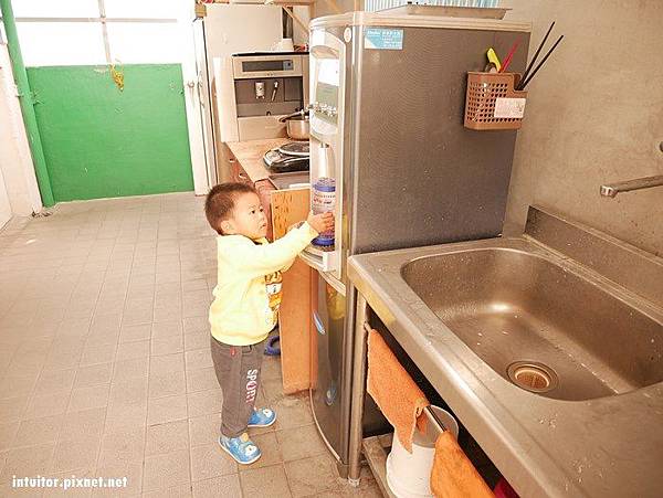 在自助廚房裝水的雞腿寶,學會行走站立,身高到達接水位置後終於能夠自己裝水了。