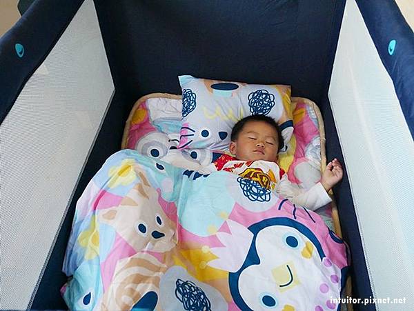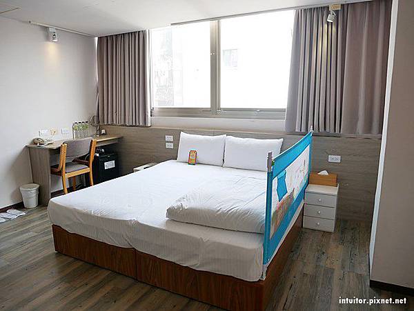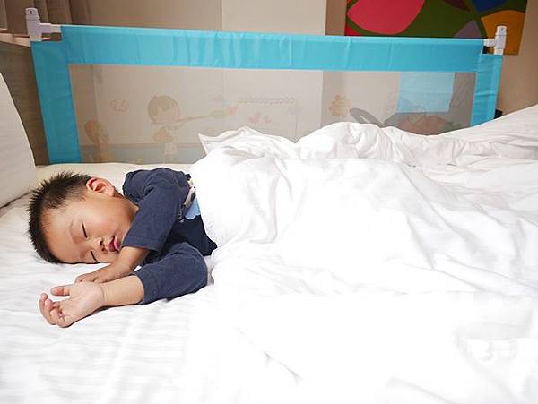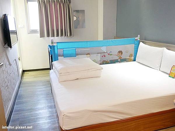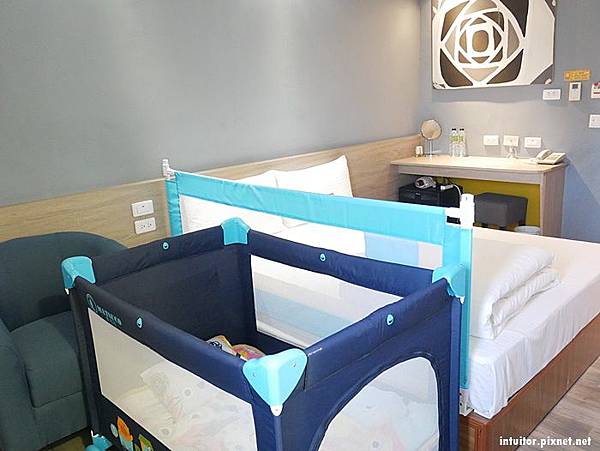 房內有加放一座嬰兒床和床邊圍欄,帶幼兒入住不必擔心小孩會滾下床。