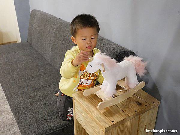 一個小小的獨角獸搖椅就能讓雞腿寶玩上一會
