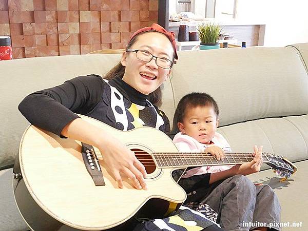 交誼廳內放置了一把吉它,不禁勾起了我高中時期因追星而學吉它的往事。我拾起吉它撥弄琴弦,聽聽吉它清脆的聲音,雞腿寶好奇的撫摸琴弦,感受著音樂帶來的魅力。