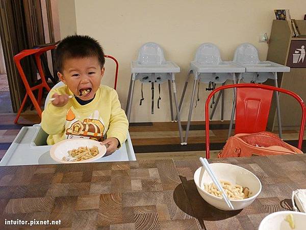 親子檔入住前還能夠預訂圍欄防止幼兒掉落床、方便幫嬰幼兒洗澡的澡盆、小椅子。這次我們入住家庭房,房內佈置簡約,環境乾淨宜人,雞腿寶非常喜歡房內的小閣樓空間。對於他來說這就是一處可以自主的小天地,他能夠一個人在此自得其樂好久,每每我拾級而上探頭一看,他總是回眸對我笑個開懷。