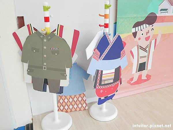 高雄有著閩南、客家、眷村、平埔等多元族群在此拓墾的足跡。這裡放置了各式族群的代表服飾版,物件本身看起來是由紙、塑膠等複合材質製成,有點重量,幼童需由成人協助拿取。