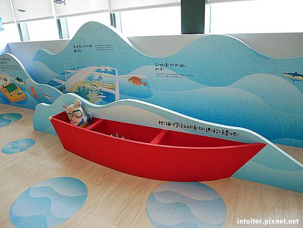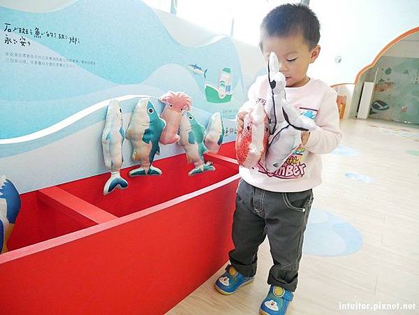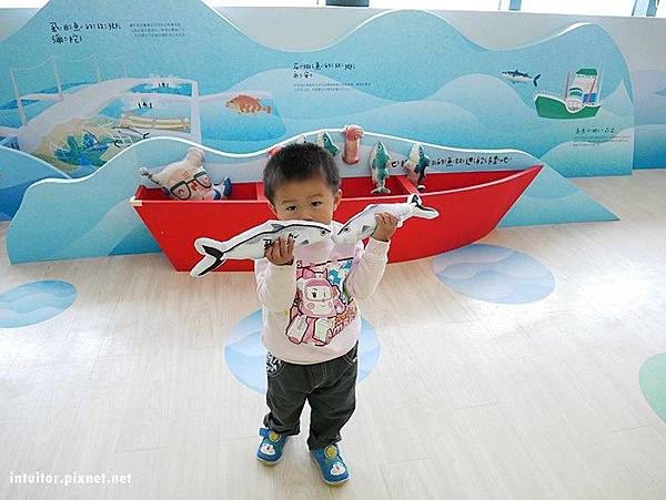 此區放置了漁船常捕撈的魚,小朋友可以拿起來認識魚,利用內置的磁鐵吸附在魚船上吧!