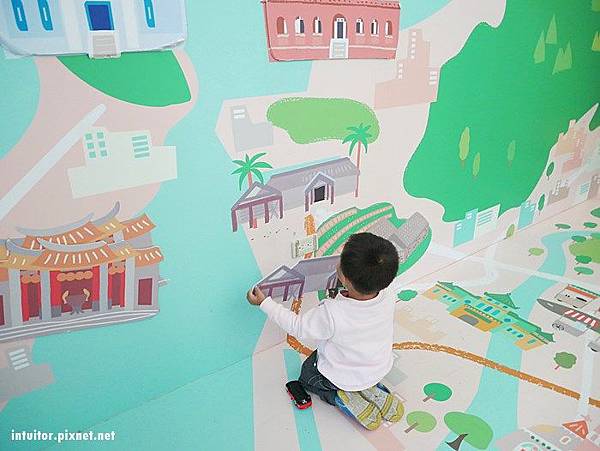 牆上的歷史建物圖案還有另外製作磁鐵,兒童可以拿起來尋找配對。