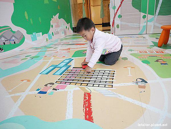這區的地面和牆上繪製了高雄地圖,雞腿寶拿出了自帶的汽車玩具,在道路上行駛,到了熟悉的景點就停下來發表幾句感言。